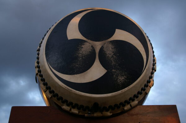 For many people, Kodo is synonymous with the mighty O-daiko, or “big drum.” Measuring 120cm in diameter, this taiko is made by hollowing out a large tree trunk, then stretching cow hides tightly over either end, which are fastened with sturdy tacks. Its weight is around 300kg, similar to that of a grand piano. The black comma-like swirls painted on the skins are called tomoe. This symbol has been used in Eastern Asia since ancient times, and there are a wide range of explanations as to why it adorns taiko. One explanation that particularly resonates with Kodo is that you paint this design on the drum hoping it draws the energy of nature out of the taiko, spinning like a powerful whirlpool that echoes out into the world. As the performer gets into the zone beating this massive drum, it’s easy to feel that torrent echoing through you, too. Perhaps the swirls draw you into the realm of the drum as they simultaneously draw all that good energy and sound out.