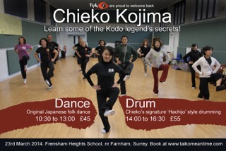 2013年に続き、ロンドンの太鼓ミーンタイムの主催で、小島千絵子のワークショップが開かれることになりました。